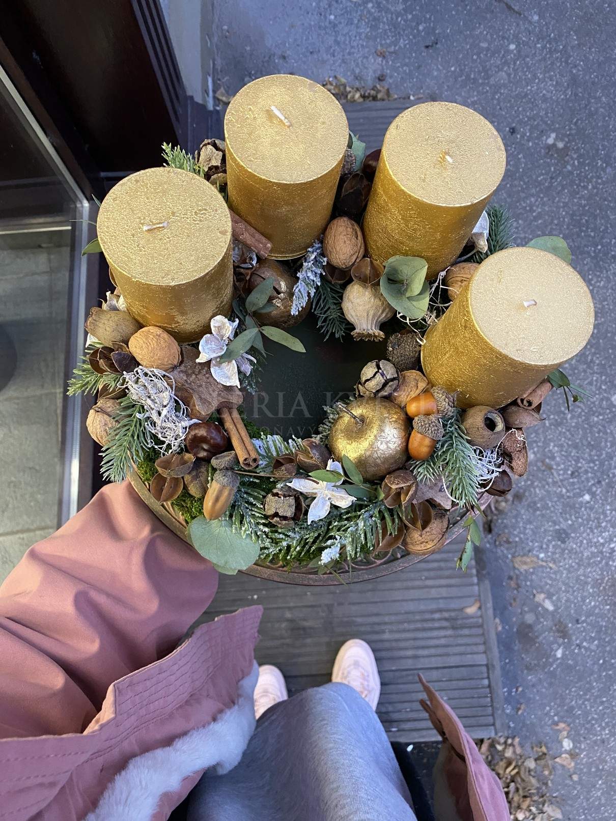 Gold and natural complement each other beautifully, the wreath is natural with a touch of luxury and is made on a moss body, it will last you for years.